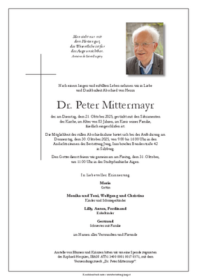 Mit tiefer Trauer geben wir bekannt, dass unser Bundesbruder Hofrat Mag. Dr. Peter Mittermayr v/o Cato am Dienstag, den 21. Oktober 2025, in Salzburg im 84. Lebensjahr verstorben ist.