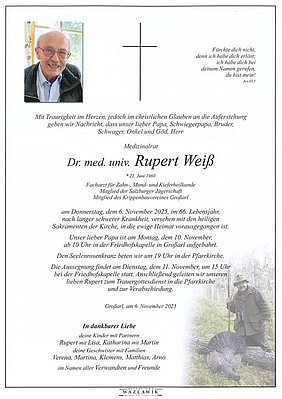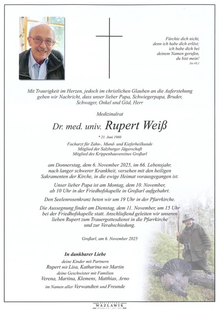 Wie heute bekannt wurde, ist am 6. November 2025, nach schwerer und langer Krankheit und versehen mit den heiligen Sakramenten der Kirche, unser Bundesbruder Medizinalrat Dr. Rupert Weiß v/o Bajazzo im 66. Lebensjahr verstorben.